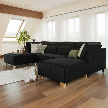 Crafted for best in comfort, the Sloane U-shape sofa in chic black features luxurious foam-filled seat cushions and a deep, inviting seat for unparalleled comfort. Indulge in plushness with bolsters, all framed by solid wood for lasting comfort.